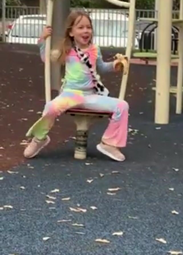 A young girl with long, brown hair, wearing a colorful tie-dye outfit and pink sneakers, is sitting on a small, stationary swing in a playground. She holds a banana in one hand and a stuffed animal in the other. She smiles and waves at the camera while twirling on the swing. The playground has a blue and brown rubber surface. In the background, there are trees, a metal fence, parked cars, and buildings. The sky is overcast.