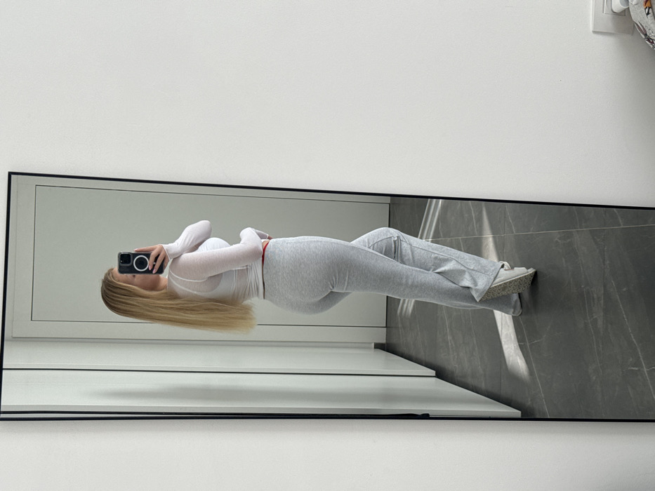 A female individual with long, straight, light blonde hair is captured in a full-length mirror selfie