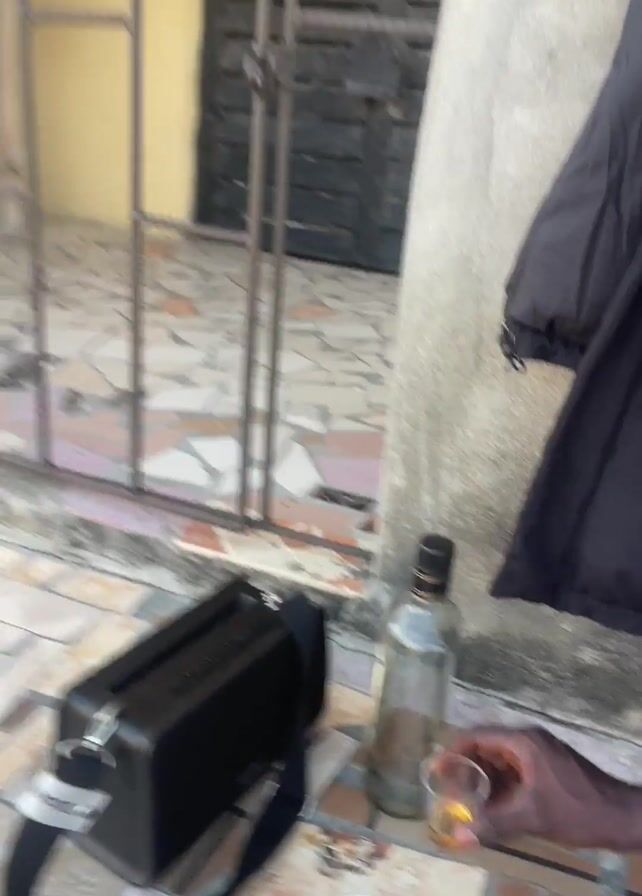 A shaky handheld camera video shows a person with a brown baseball cap on a porch. A black bag is on the ground, as is a mostly empty bottle of alcohol. The person picks up a shot glass of a dark liquid. The porch is made of tile.