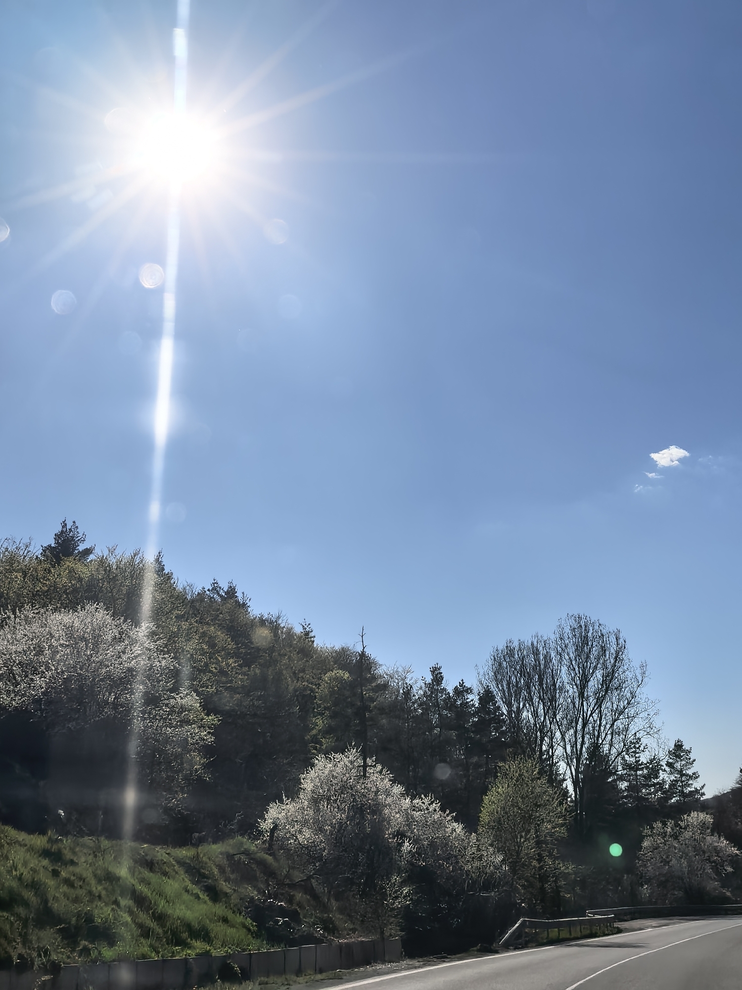 The image depicts a sunny day in Klisura, Bulgaria, likely in the springtime. The sky is a clear, bright blue with the sun positioned in the upper left quadrant, creating a strong lens flare effect. A single, small, puffy white cloud is visible in the upper right quadrant. The foreground consists of a paved road winding into the distance. A concrete barrier runs alongside the road. Beyond the barrier, a grassy slope rises to meet a dense array of trees. Many of the trees are in full bloom with white blossoms. Some are coniferous, while others appear bare or just beginning to leaf out. The composition suggests a rural or mountainous area on a bright, sunny day.