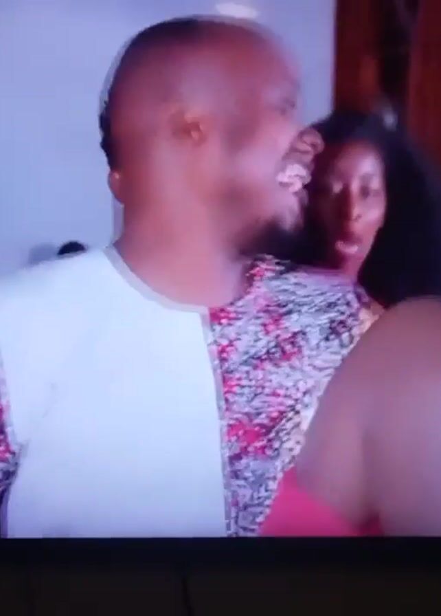 A TV screen displays scenes of people dancing. In one scene, a group is inside a room with blue lighting, dancing in various outfits including a red dress, a white shirt with jeans, and a gold dress. Another scene shows a group of people outside, wearing traditional African clothing, dancing in front of a building. The audio appears to be music.