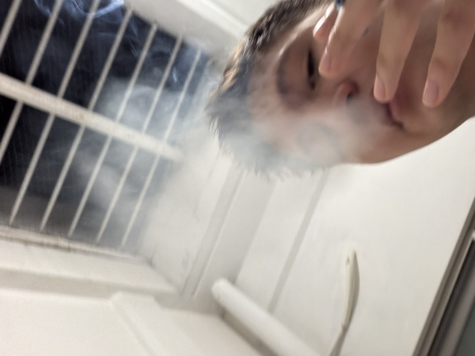 A tilted view depicts a person exhaling smoke, likely from a cigarette or vape. The person's face is partially visible with their fingers near their mouth. In the background, there's a gated window or vent, slightly obscured by the smoke. The overall setting is enclosed and appears to be indoors, characterized by white walls and light. The image is slightly blurry.