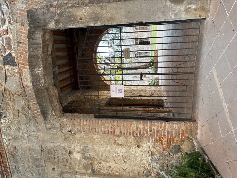 An arched wrought-iron gate, slightly ajar, reveals an exterior view. A rectangular sign, bearing text and a QR code, is affixed to the gate's center. The gate is framed by a distressed stone and brick structure featuring an inner cavity with visible wooden supports. The foreground displays the textured stone and brick wall. A section of tiled pavement and foliage is present to the right.