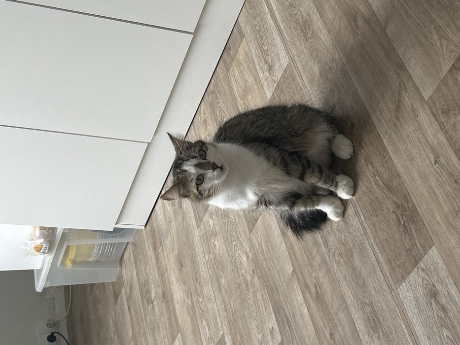 - "This image depicts a domestic short-haired cat sitting on light brown, wood-grain patterned laminate flooring in an indoor setting within the city of Metz, France" by FM-KvJN53, licensed under CC BY 4.0