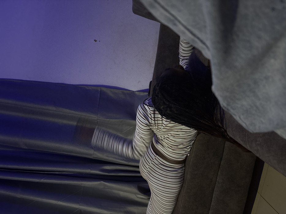 From a high angle, a person with long dark braids is seen lying on a brown couch. They wear a striped long-sleeved shirt and matching pants. The head is near the top of the frame. The left arm is extended to the left, partially obscured by a shiny gray sheet. A gray piece of fabric is in the top right corner of the frame, out of focus. The room has a blue-gray wall, with a faint dark spot. The couch faces the wall.