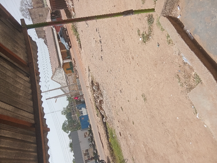 The image depicts a street scene in Jushi, Nigeria, under daylight. The foreground consists of reddish-brown dirt ground with sparse patches of green vegetation and scattered small rocks. A corrugated metal roof structure spans the top of the frame, supported on the right by a vertical green pole. A concrete curb is visible in the lower right, with minor debris nearby. In the mid-ground, a narrow, dark-colored paved road extends horizontally. A dark-colored sedan is positioned on this road in the right-center, facing away from the viewer. To the left on the same road, a person wearing a pink garment walks alongside a blue container structure. Further left, a person on a red motorcycle travels in the same direction as the sedan. The background features several buildings: a white/grey building with multiple exterior air conditioning units on the left, followed by the blue container. A building with horizontal yellow and dark striped walls and a brown roof is centrally located. To the right, older, rustic structures are visible, including one potentially two-story building and a smaller metal-sided shed. Utility poles with overhead lines are present along the road, and scattered trees appear in the distant background. The sky is light and appears hazy.
