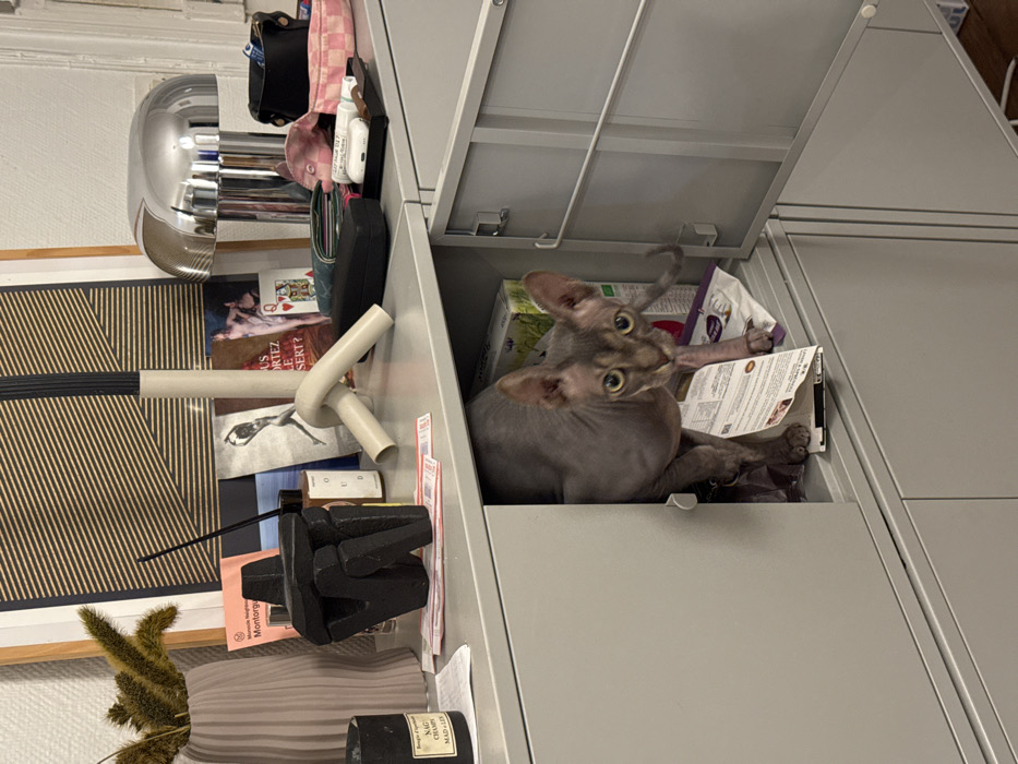 - "A grey Sphynx cat is inside a partially opened grey filing cabinet drawer" by FM-QhCsg2, licensed under CC BY 4.0