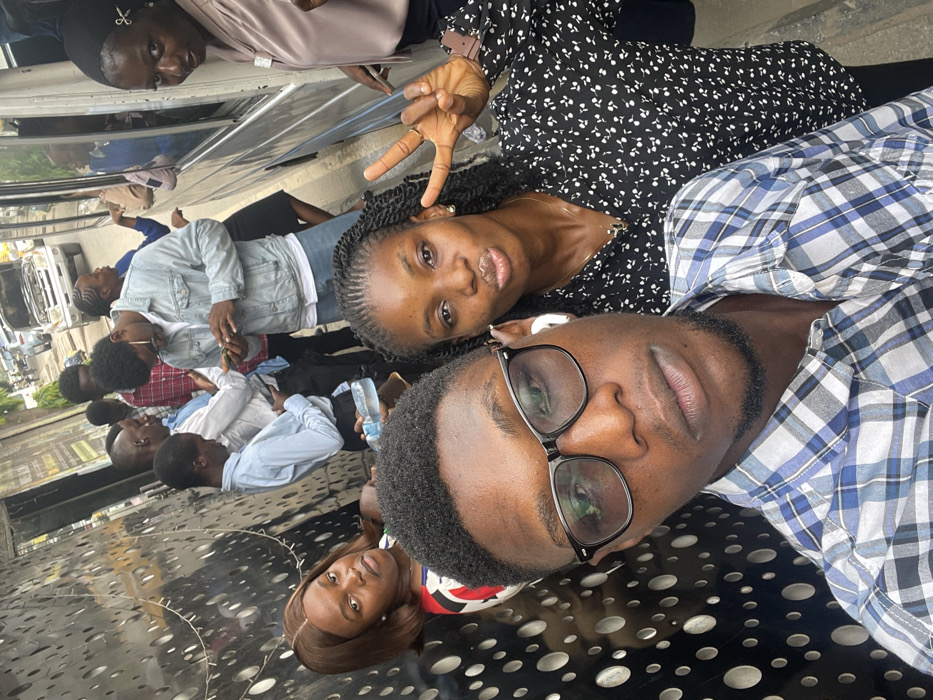 The image depicts an outdoor urban scene featuring multiple individuals on a street or sidewalk in Unknown, Unknown. In the immediate foreground, a dark-skinned male, wearing black-framed glasses and a blue and white plaid shirt, is taking a selfie with a dark-skinned female. The male looks directly at the camera with a neutral expression, and a white earbud is visible in his right ear. The female, with long dark braided hair and wearing a black patterned shirt and a necklace, is making a peace sign with her right hand and pouting her lips towards the camera. To their left and slightly behind them, a dark-skinned female with shoulder-length brown hair and a multi-colored top looks towards the camera, holding a clear plastic water bottle. Behind these foreground figures, a group of approximately six to eight individuals, mostly men, are standing. Many are observed interacting with their mobile phones. One prominent male in this group wears a light blue denim jacket, dark sunglasses, and has dark curly hair, focused on his phone. Another male to his left wears a light blue collared shirt and is also looking at his phone. On the far right, a light-colored bus or minibus is parked. A dark-skinned female, wearing a light-colored collared shirt and a dark head covering, is leaning out of an open bus window, looking directly at the camera with a slight smile. Other individuals are partially visible inside the bus or near its windows. The background reveals a paved street with an open-hooded light-colored SUV, suggesting it is stopped or disabled. Other vehicles and some green foliage are visible further down the street. The left side of the frame features a dark, possibly metallic wall with a patterned series of raised circles or dots. The scene is illuminated by natural daylight.