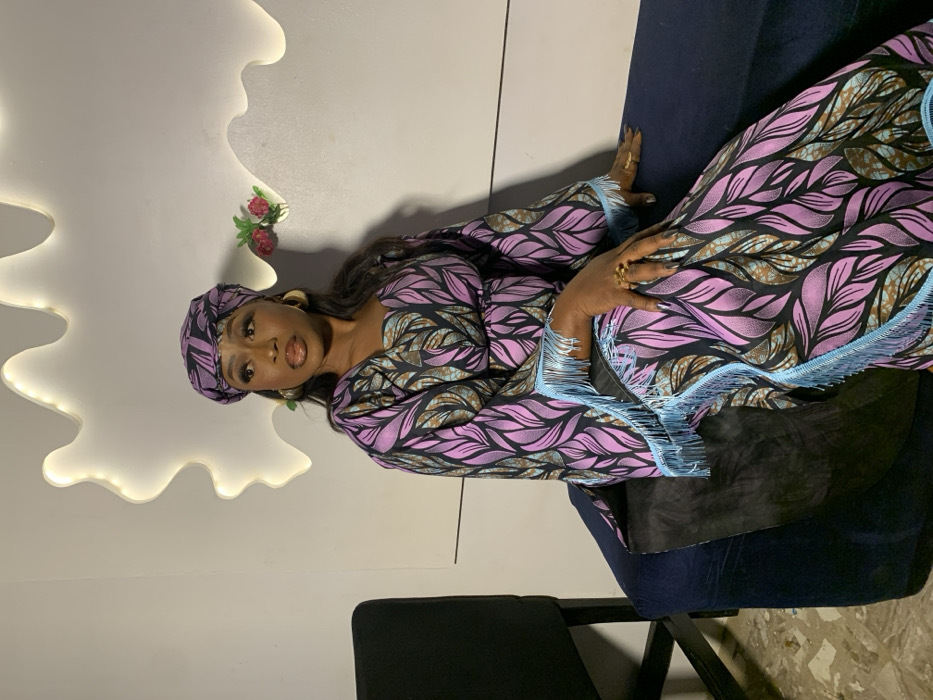 A woman lies angled on a blue velvet sofa, wearing a patterned, lilac, black, and brown dress with light blue fringe detail. She has matching headwear and gold hoop earrings. Her left hand rests on her dress, and the other on the sofa. Behind her is a white wall with a decorative, illuminated white shape. A small floral decoration sits near the top of the shape. The bottom of the photo shows a black chair and a marbled floor. The room is well lit.