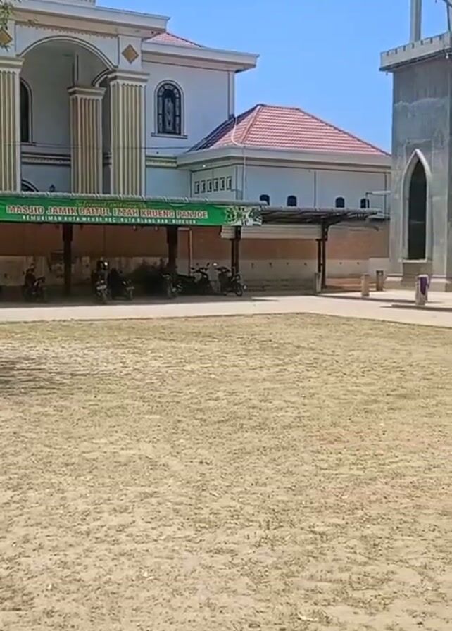 exterior of two buildings, a parking area, and a man. The camera pans from left to right, starting with a two-story white building with gold-painted columns and arched windows on its upper floor. A green banner with white text is strung across a covered parking area filled with parked motorbikes. In the foreground, there is a sandy area with sparse vegetation. As the camera continues to pan, a man wearing a yellow shirt and dark pants walks up a set of steps towards a gray, unpainted building. This building also has arched windows. The sky is clear and blue, and some tree branches with yellow flowers hang down from the top of the frame.