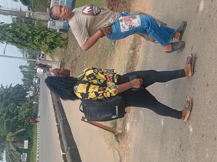 The image depicts an outdoor scene on a paved road and adjacent verge in Awka, Nigeria, specifically near the UNIZIK Bus Stop, indicated by a partially visible sign