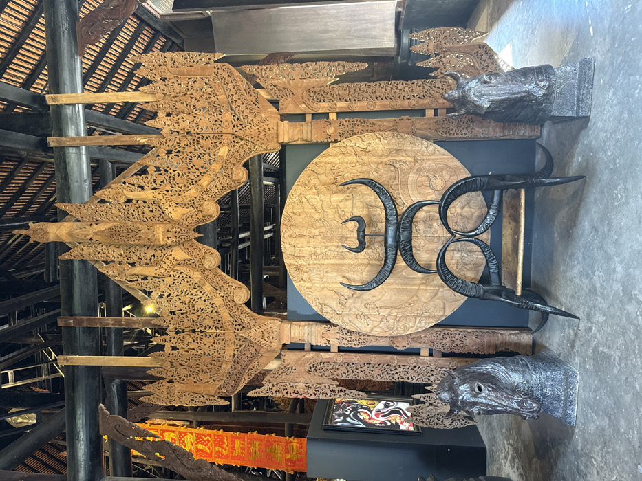 A complex interior features elaborate wooden carvings, reminiscent of wings, attached to black columns. A large, circular wooden panel carved with intricate designs is prominently displayed, overlaid with stylized, curved black horns. Above the panel, there is a sculpture of a horse's head. Below it, there is another horse's head sculpture and a framed print. The setting evokes a museum or gallery space.