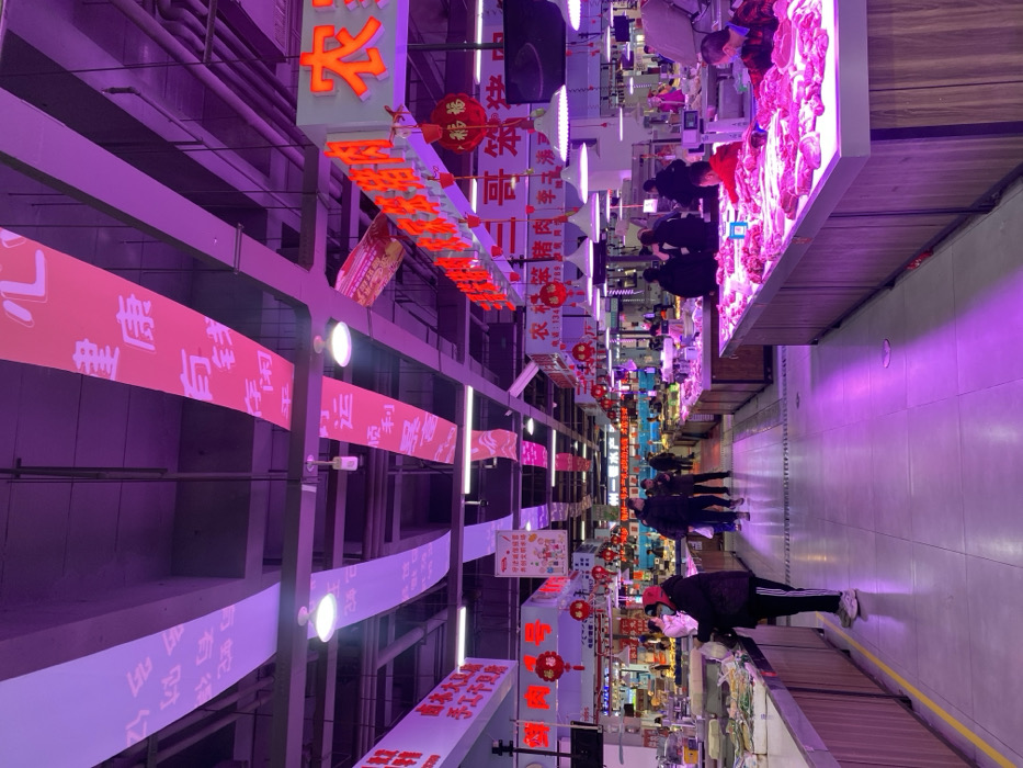 An indoor market scene with rows of stalls and hanging banners. Banners are in white, pink, and red, displaying Chinese characters. Chinese lanterns are also hanging. People are browsing at stalls, some wearing masks. There are signs with Chinese text and numbers, including phone numbers. Lighting is varied, with both white and purple hues. The perspective is from within the market, looking down a main aisle.