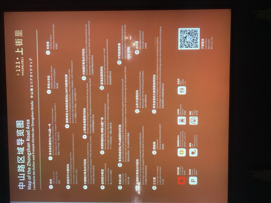 This is a map of the Zhongshan Road area in Qing Dao Shi, China. The map is on a dark orange background and is in Chinese and German. The map highlights 22 points of interest, including the Qingdao Railway Station, the former site of the Qingdao Club, the former site of the Qingdao Seamen's House, the former site of the Qingdao Commercial and Savings Bank, St. Michael's Cathedral, the former site of Villa Anna, the former site of the Governor's Hall, the former site of the Qingdao Chinese Merchants Association, the former site of the Bank of Communication, the former site of the Shandong Grand Theater, and the former site of the Qingdao Dabao Dao Power Distribution Station. The map also includes a legend with symbols for parking, toilets, train station, metro, and a QR code. The map is likely located in a public place, such as a tourist information center or a museum.