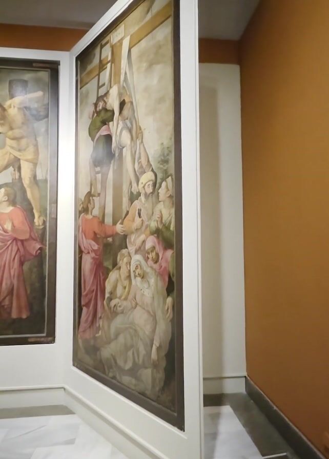 display of paintings in a gallery. Two large framed paintings are visible, attached to a structure that allows them to rotate and reveal the paintings on the opposite side. The paintings depict religious scenes with figures in biblical settings. The walls of the gallery are painted white and orange. The floor is covered with white marble tiles. The paintings are well-lit, possibly with spotlights. The focus is on the rotating structure and the display of the paintings.