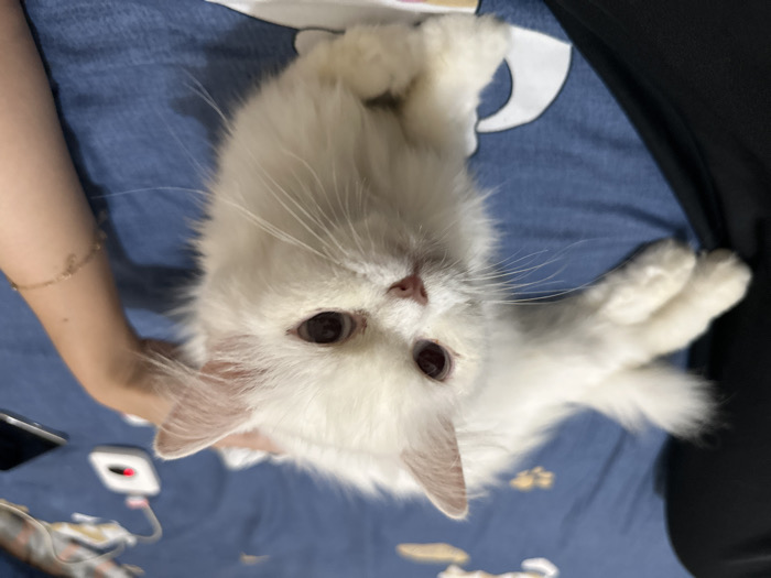 - "A white, long-haired cat with reddish-brown eyes rests on a blue patterned bedsheet in an indoor setting" by FM-gujip2, licensed under CC BY 4.0