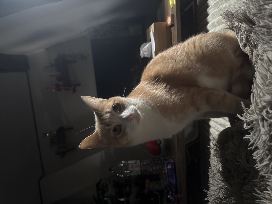 An indoor scene in Wattrelos, France, depicts a domestic cat seated upright on a textured, shaggy light gray blanket or rug. The cat is orange and white, with prominent ears, light-colored eyes, a white muzzle, and a pink nose, looking directly towards the viewer. A localized, strong light source illuminates the front of the cat. In the midground, a dark-colored table is visible. On the left side of the table, a clear plastic water bottle, a red and white spherical object resembling a Poké Ball, and a purple wrapper are present. On the right side of the table, a light brown tissue box with a white tissue, a small red rectangular object, and a small yellow object are positioned. The background is dimly lit, revealing shelves with various items and a large, dark rectangular screen, likely a television.