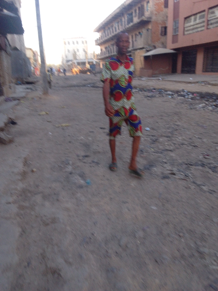 The image depicts a man walking on an unpaved road in Sabon Gari East, Nigeria