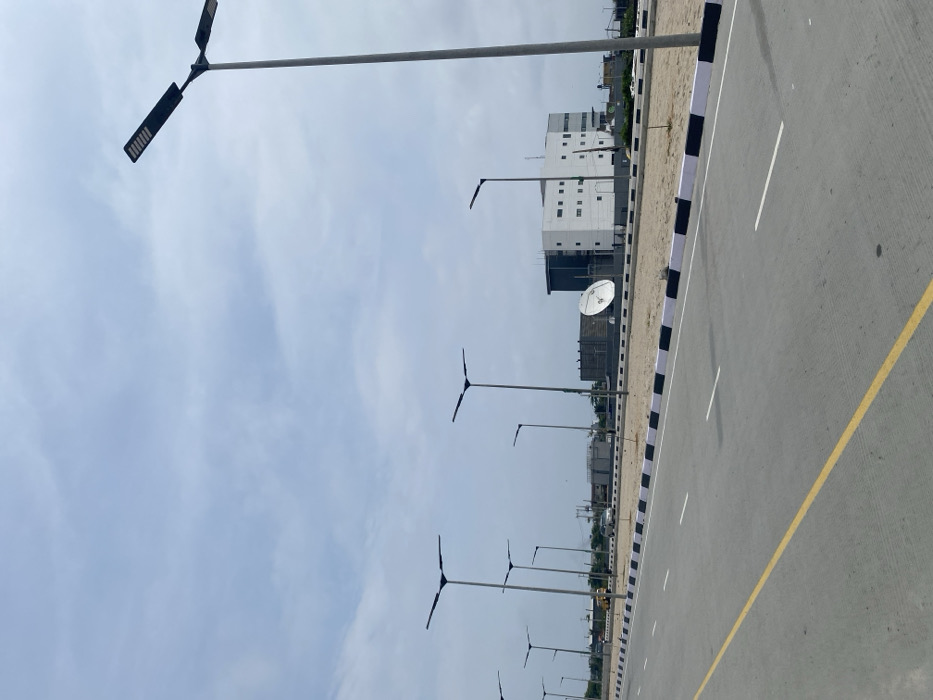 The image displays a concrete multi-lane roadway in Alaguntan, Nigeria, under a partially cloudy sky. The road's left edge is marked by a solid yellow line, with dashed white lines defining traffic lanes. To the right of the roadway, a curb adorned with black and white stripes borders an unpaved median strip composed of light brown soil. Numerous tall, grey metal street light poles, each fitted with a T-shaped LED fixture, are positioned along the median. In the background, a modern multi-story building, characterized by a white facade with dark grey horizontal sections, is prominently visible. A large white parabolic satellite dish is situated on the ground in front of this building. Distant vehicles, including a yellow truck and a white car, are faintly discernible on a parallel road further in the background. No individuals are present in the frame.