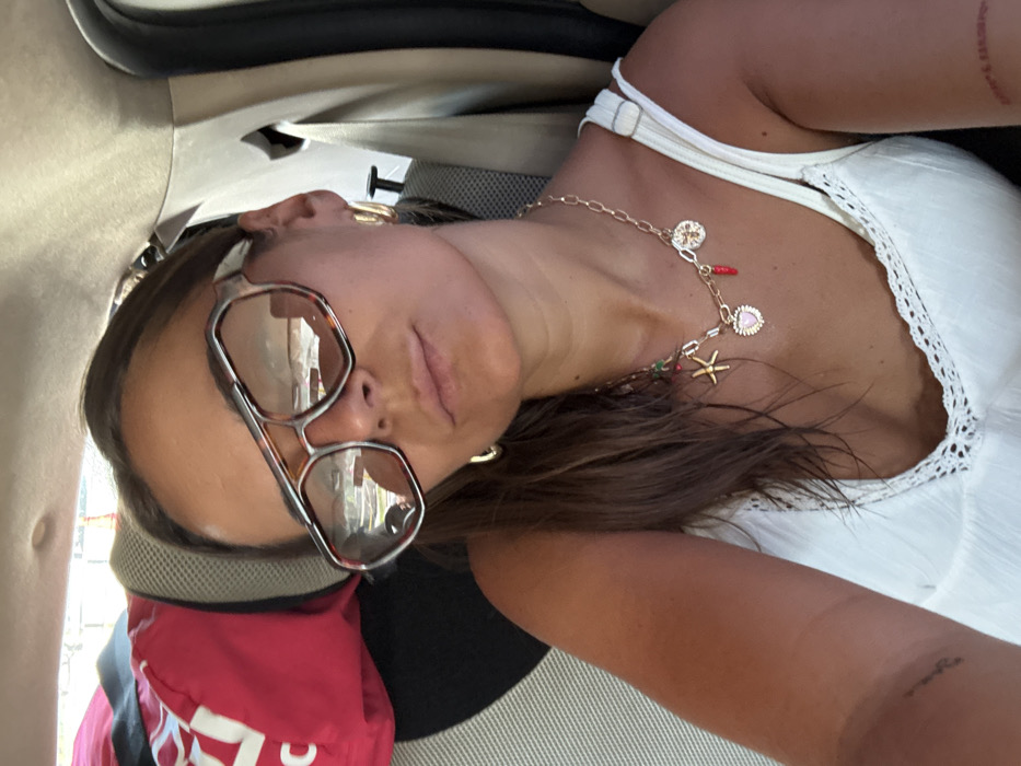 A woman with brown hair and tortoise shell sunglasses is sitting in a car, wearing a white, lace-trimmed tank top. She has a gold chain necklace with various charms. Her skin is tanned, and her lips are a natural pink color. The interior of the car is light-colored, and part of a red bag is visible next to her. The photo is taken from a slightly high angle and rotated sideways.