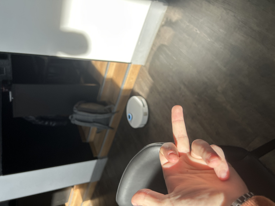 The scene is an interior view within the city of Bochum, Germany. A human left hand, displaying a fair skin tone, occupies the lower-left foreground, with its middle finger extended and pointed towards the center of the frame. A portion of a dark gray chair is visible behind the hand. On the dark, possibly wood-laminate, floor in the midground, a light gray, circular robotic vacuum cleaner, consistent with models like the Roborock Q7 Max, is stationary. It features a central, blue-rimmed navigational sensor or button. In the background, a multi-level interior structure is present. A set of light-colored wooden stairs with gray nosing ascends towards the left. A gray backpack rests on one of the lower steps. Dark, possibly black, furniture or structural elements are visible behind the stairs. A prominent white vertical column or wall section on the right is brightly illuminated by direct sunlight, casting strong, distinct shadows across the floor and partially over the robotic vacuum cleaner. Another dark wall segment is to the left of the stairs.
