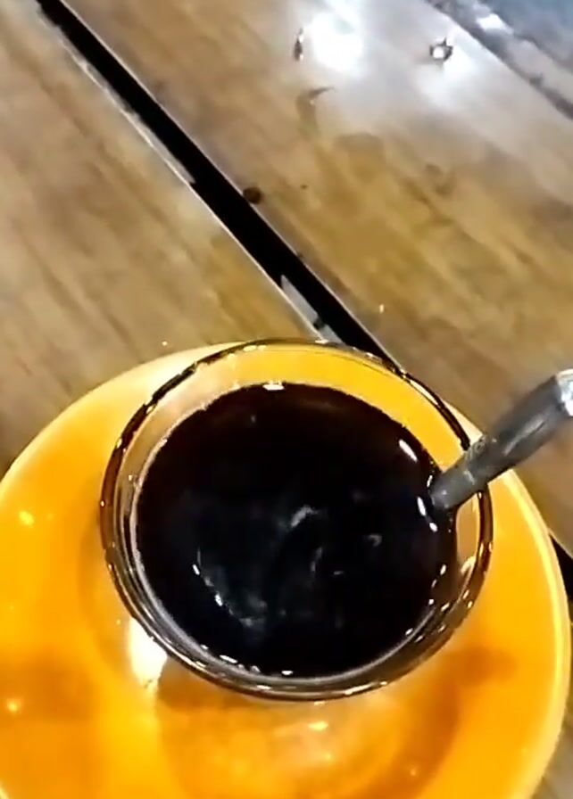 The camera shows a clear glass cup filled with black liquid sitting on a bright yellow saucer
