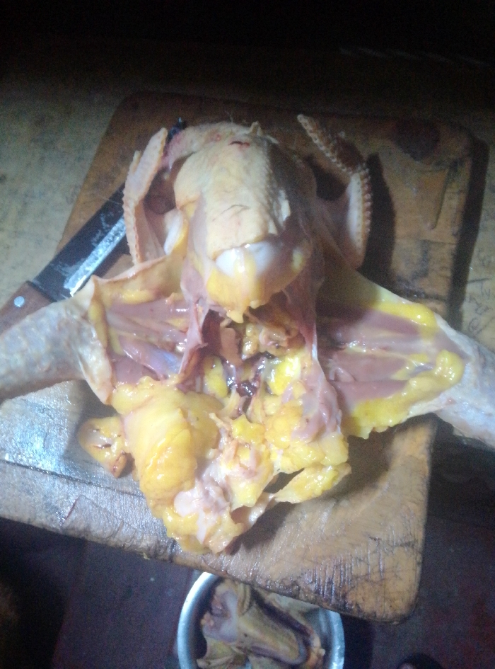 The image displays a plucked, eviscerated raw chicken lying splayed open on a dark, worn wooden cutting board. The chicken's breast cavity is open, exposing a substantial amount of yellowish fat and some reddish-purple internal tissues. A knife with a dark wooden handle and a silver-toned blade is positioned on the cutting board to the upper left of the chicken. Below the cutting board, a metallic bowl contains additional raw chicken parts, possibly offal or discarded portions. The surrounding environment is dimly lit, suggesting an indoor setting such as a kitchen or food preparation area. The exact location within Nairobi, Kenya, cannot be determined from the visual evidence presented.