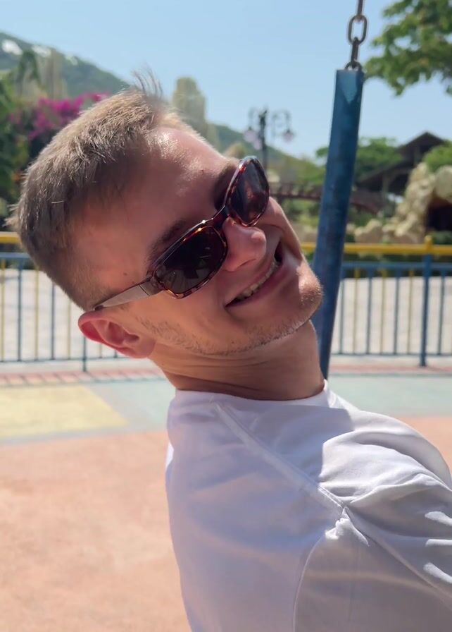 A young man with short, light brown hair and sunglasses is sitting on a swing set in what appears to be a park or recreational area