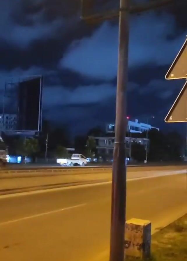 dark, urban street at night. The road is illuminated by orange streetlights. Cars and a truck are moving on the road. In the background, buildings are visible. There is a lamp post on the right side of the frame. A triangular road sign is attached to the lamp post. The sky is dark with cloudy patches. The video is taken from a stationary position on the side of the road.