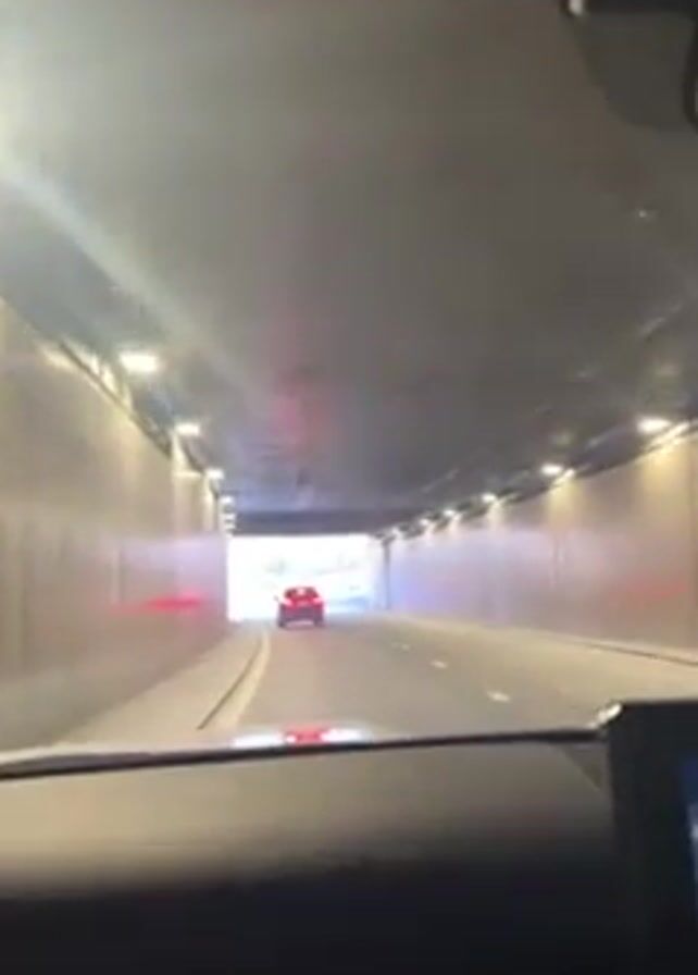 A first-person perspective video shows a car driving through a short tunnel