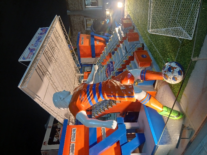 A vividly colored soccer display featuring a mannequin kicking a soccer ball. The figure wears an orange and blue uniform, with green shoes. A miniature soccer field is visible, along with a goal net and stadium seating in orange and blue. A large advertising billboard is in the backdrop. The scene is illuminated, likely at night.