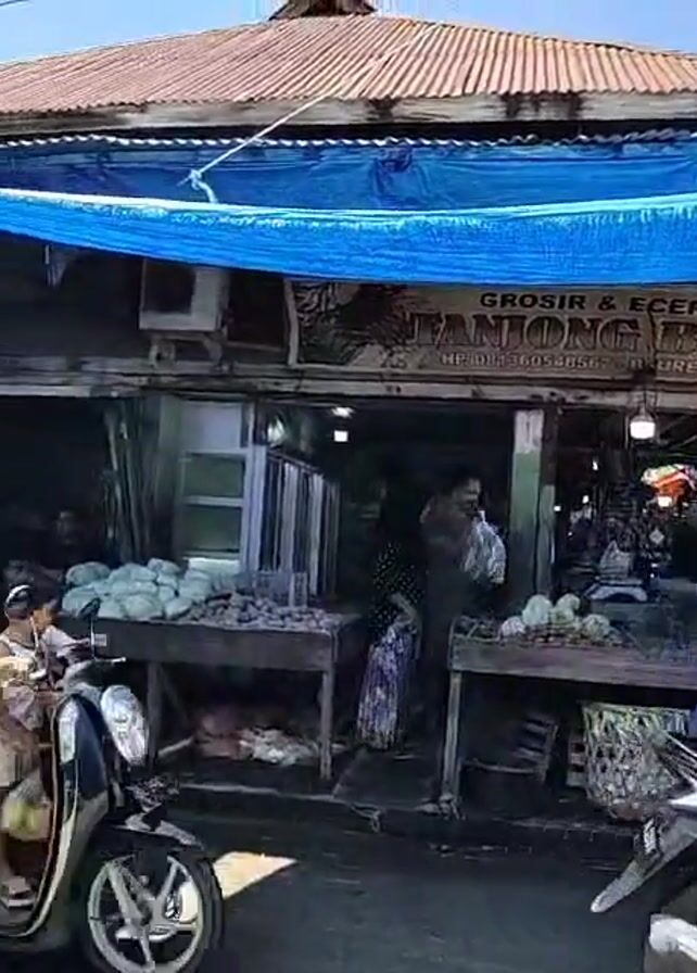 bustling outdoor market scene. Several people are on motorcycles, maneuvering through the narrow lanes between stalls. The stalls are lined with various produce, including potatoes, melons, and other vegetables. The vendors stand behind their displays. The market is covered by a patchwork of blue tarps, providing shade from the bright sunlight. A tall communication tower is visible in the background. Some pedestrians stroll through the market, seemingly browsing the goods.