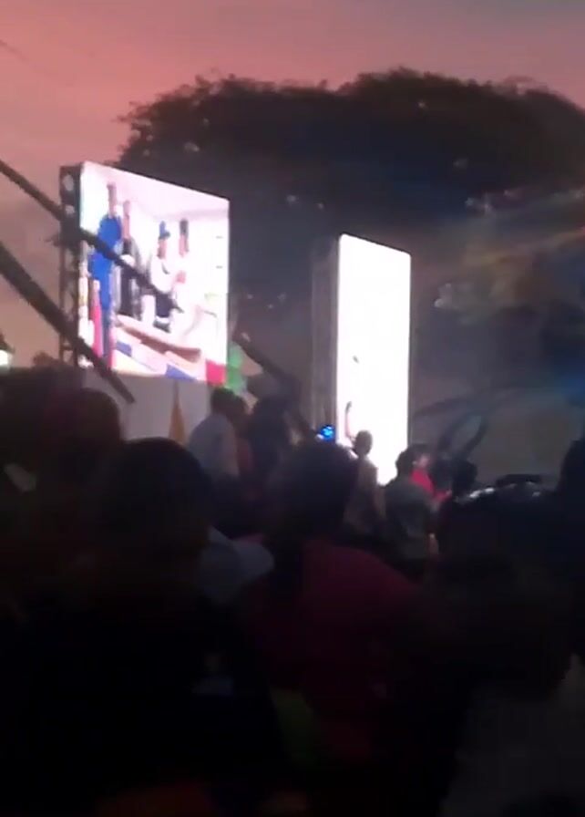 gathering of people at an outdoor event at dusk. Two large screens are visible, one showing a video. The crowd is silhouetted against the pink and purple sky, and lampposts are interspersed among them. People are standing and moving around. Palm fronds frame the shot on the left. The event appears to be taking place in a public space.