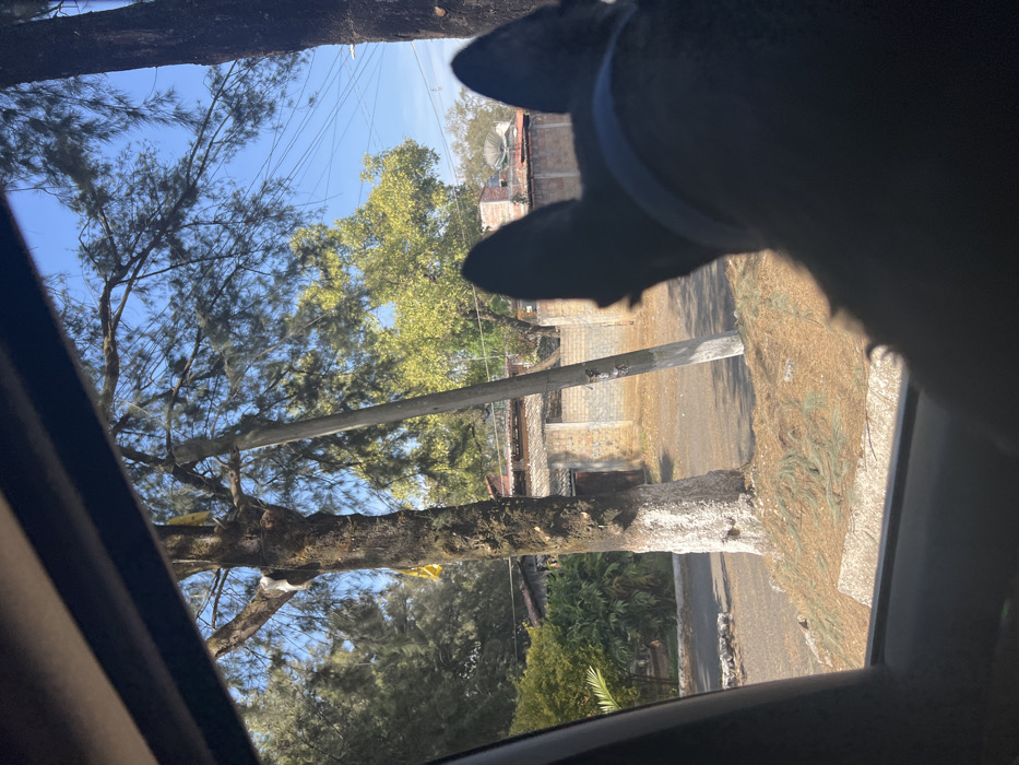A dog's head with a blue collar obstructs the view from a car window. The outside scene reveals a road with vegetation along the side, several trees, and buildings in the background. The sky is clear blue with visible power lines. The trees have varying foliage, from dense and green to sparse and brown. A tree trunk beside the road is painted white.