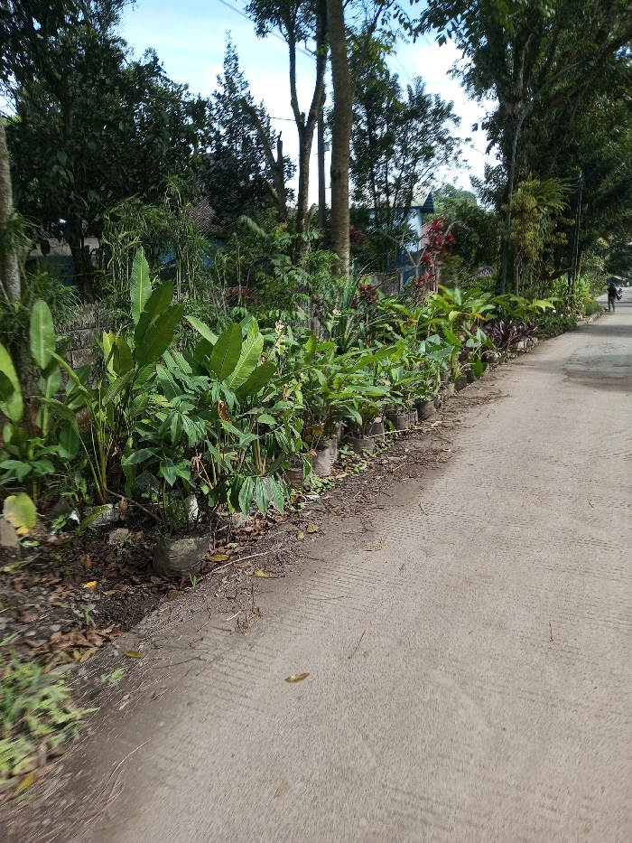 The scene depicts a roadside environment in Ariyalai, Sri Lanka, under natural daylight. A light gray paved path or road occupies the right side of the frame, extending into the distance and exhibiting faint tire impressions. Along the left edge of this path, a linear arrangement of approximately 20-30 potted foliage plants is present. These plants, predominantly green with some featuring reddish coloration, are contained within dark, utilitarian pots, possibly fabric or plastic. Varieties include broad-leaved tropical plants and other ornamental species. The ground immediately adjacent to the path and beneath the potted plants consists of dark soil mixed with scattered dry leaves and sparse green ground cover. Behind the potted plants, a dense band of natural vegetation is visible, comprising numerous tall trees with varied green canopies and distinct trunks. In the distant background, partially obscured by the tree line, a structure with a blue roof is faintly visible. A single human figure, indistinct due to distance, is observed on the paved path in the far background, walking away from the viewer.