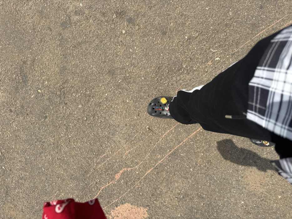 The image presents a high-angle view of the lower body of an individual and a portion of a second individual, situated on a textured, light brown asphalt or concrete surface in Osu, Nigeria. The central figure wears a black and white plaid shirt over black pants with a white vertical stripe along the outer seam. Their left foot is clad in a dark grey Croc-style shoe, adorned with a yellow circular charm and a multi-colored rectangular charm on its upper surface. A distinct shadow, likely cast by the central figure, extends towards the upper right, indicating direct sunlight. In the bottom right corner, a segment of red fabric with white patterns, possibly part of clothing or an accessory, is visible, suggesting the proximity of a second person. Faint, reddish-orange chalk lines are drawn on the ground, forming an irregular, wavy pattern.
