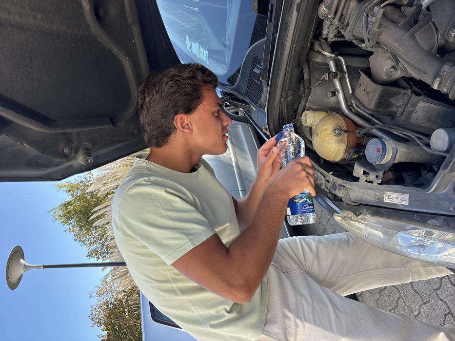 This image depicts an outdoor scene in Oeiras, Portugal, under clear daytime conditions. A young adult male, dressed in a light-colored (likely light green or beige) short-sleeved t-shirt and light beige trousers, is leaning over the front of a dark-colored vehicle with its hood fully open. He is actively pouring water from a transparent plastic bottle, identifiable as "Luso" brand mineral water by its label, into a translucent, yellowish-beige plastic reservoir located in the car's engine compartment, consistent with a coolant expansion tank. The car's engine bay reveals various components, including the front left headlight assembly. Partially visible behind this car is the front section of a silver-colored vehicle. In the background to the left, a modern street lamp with a disc-shaped top stands against a clear blue sky. Further back, tall ornamental grasses and green deciduous trees are visible. The ground surface is paved with light-colored interlocking bricks.