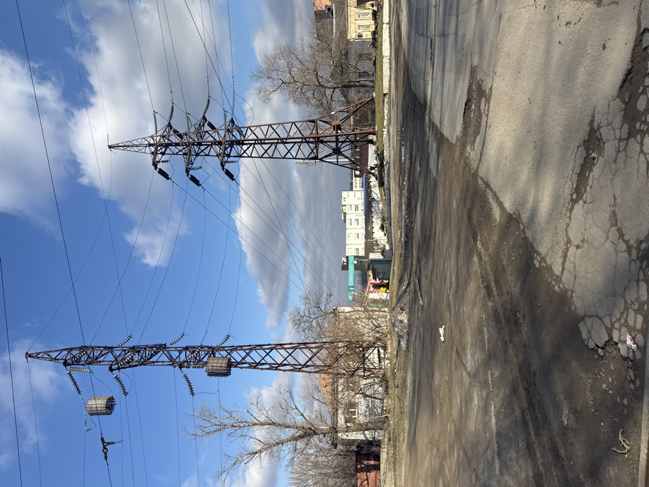 The image depicts an outdoor, urban-industrial scene in Rostov-on-Don, Russia, under a partly cloudy blue sky. Two prominent, rusty-brown lattice-steel electricity transmission towers dominate the midground and background, carrying multiple overhead power lines equipped with insulators. The tower on the left features two cylindrical apparatuses suspended from its upper cross arms. The foreground consists of a degraded ground surface, primarily unpaved or heavily damaged asphalt and dirt, exhibiting numerous cracks, potholes, and tire tracks, suggesting muddy or dusty conditions. Small pieces of litter, including white plastic debris, are scattered across this area. In the mid-distance, bare deciduous trees and sparse brush are visible, indicating a cold season. Behind the vegetation and to the left, a single-story building with a light-colored facade and a reddish-brown tiled roof is partially obscured. To the right of the left pylon, a small, colorful kiosk-like structure (yellow and red) is situated next to a rectangular green sign displaying white Cyrillic text, which includes the word "ДОН" (DON), referencing the city. In the background, beyond the immediate structures, several multi-story, light-colored buildings with flat roofs are visible, interspersed with other lower-profile buildings that appear to be residential or light commercial. No individuals, vehicles, or specific actions are present within the frame.