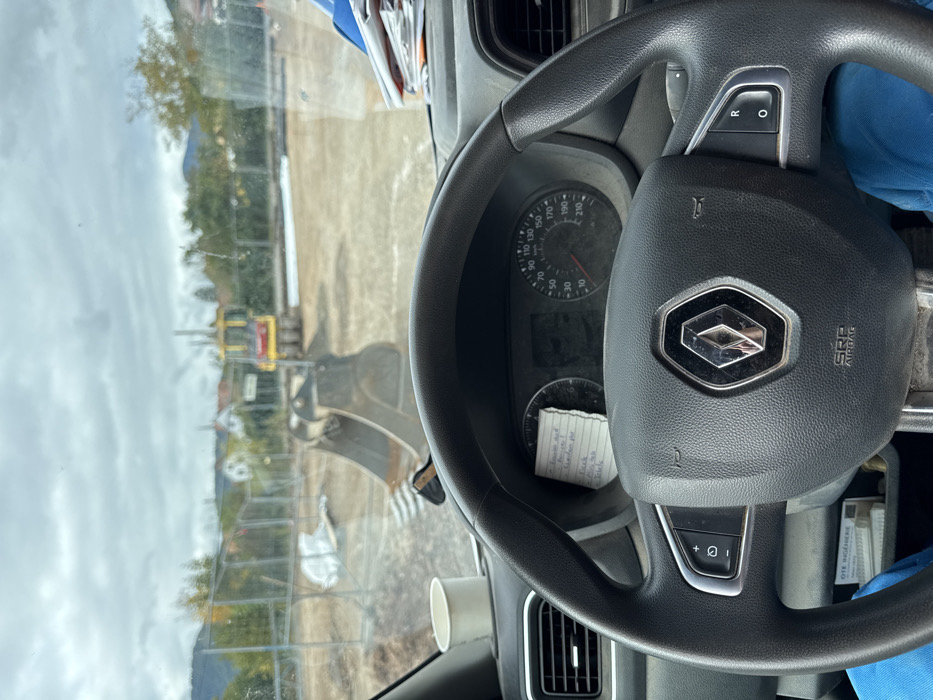 The image presents a first-person view from inside a stationary Renault vehicle, looking forward through a dusty windshield at an active construction site in Scherwiller, France, under an overcast sky. In the immediate foreground, a black Renault steering wheel with a silver diamond logo and "SRP AIRBAG" inscription is centrally positioned. Control buttons are present on both the left and right spokes of the steering wheel. Behind it, a crumpled piece of white paper with handwritten text is tucked into the dashboard, partially obscuring the instrument panel, which includes a speedometer with markings up to 210 km/h. To the left on the dashboard, a white disposable cup is visible. To the right, a stack of papers and folders rests on the dashboard. The lower portion of a person's legs, clad in blue pants, is visible at the very bottom of the frame, indicating a driver or passenger. Beyond the vehicle's interior, a large, dark-grey excavator bucket occupies the midground, positioned on cleared, light-brown earth. Further back on the site, a yellow road roller (compactor) is visible. A temporary fence, possibly chain-link, delineates parts of the construction area, behind which white tarpaulins or construction materials are present. In the background, residential buildings with traditional roofs are visible amidst trees displaying some autumn foliage, indicating proximity to a populated area. Distant hills or mountains frame the horizon beneath a uniform grey, cloudy sky.
