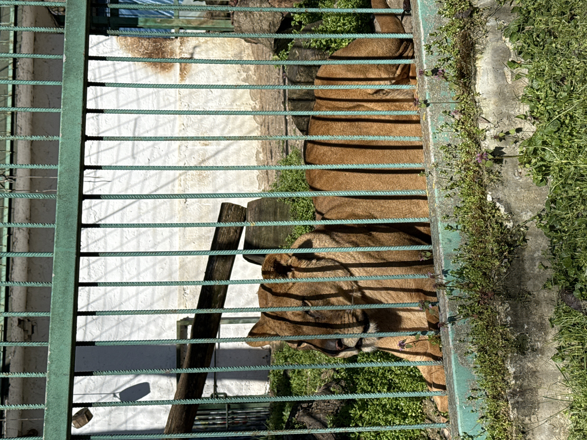 A lion is viewed through the bars of its enclosure. The enclosure features green metal bars and a white concrete wall. Plants grow along the perimeter of the enclosure. The location is Razgrad, Bulgaria.