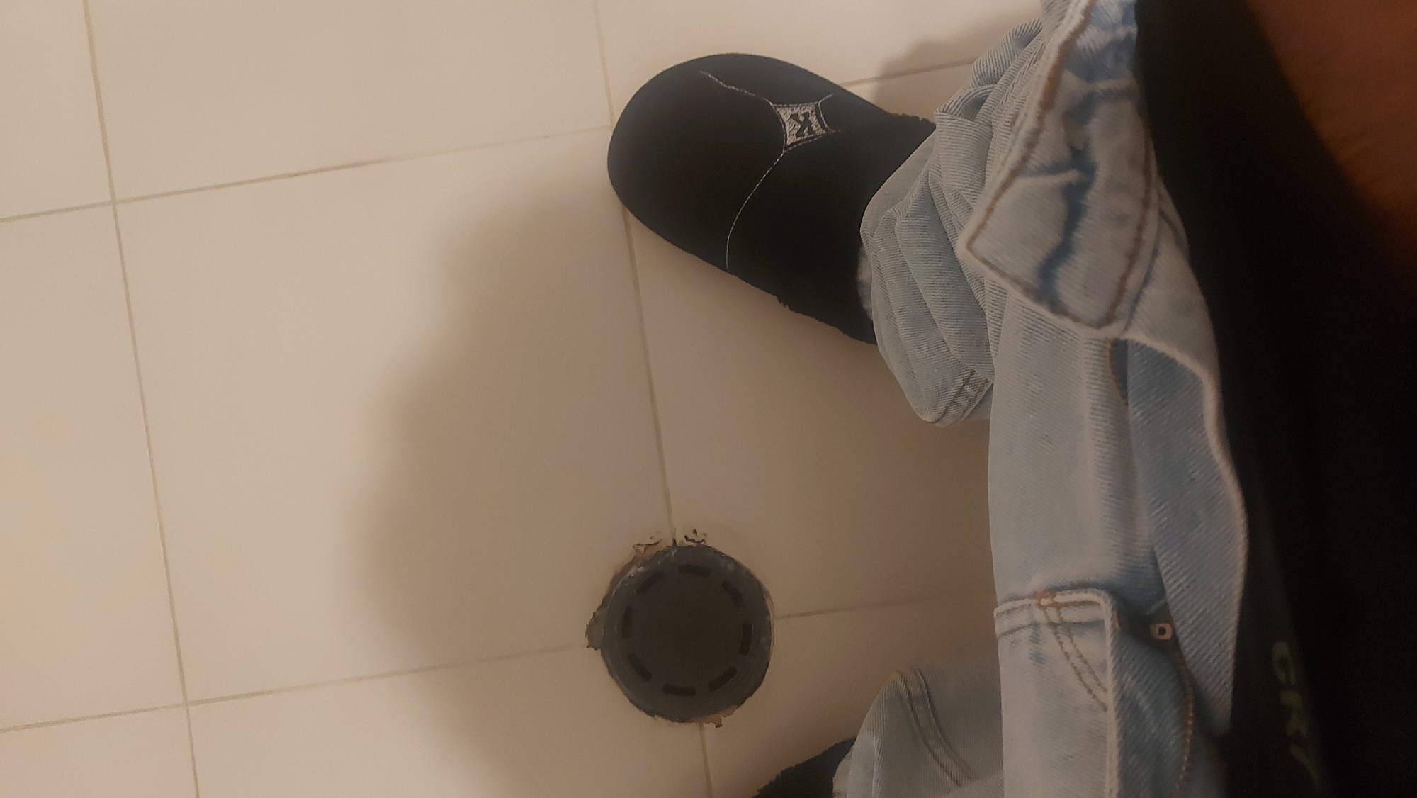 A top-down shot shows a tiled bathroom floor. A black slipper with a white logo sits near a drain. A light blue denim jacket hangs nearby. The location is Unknown, Unknown.
