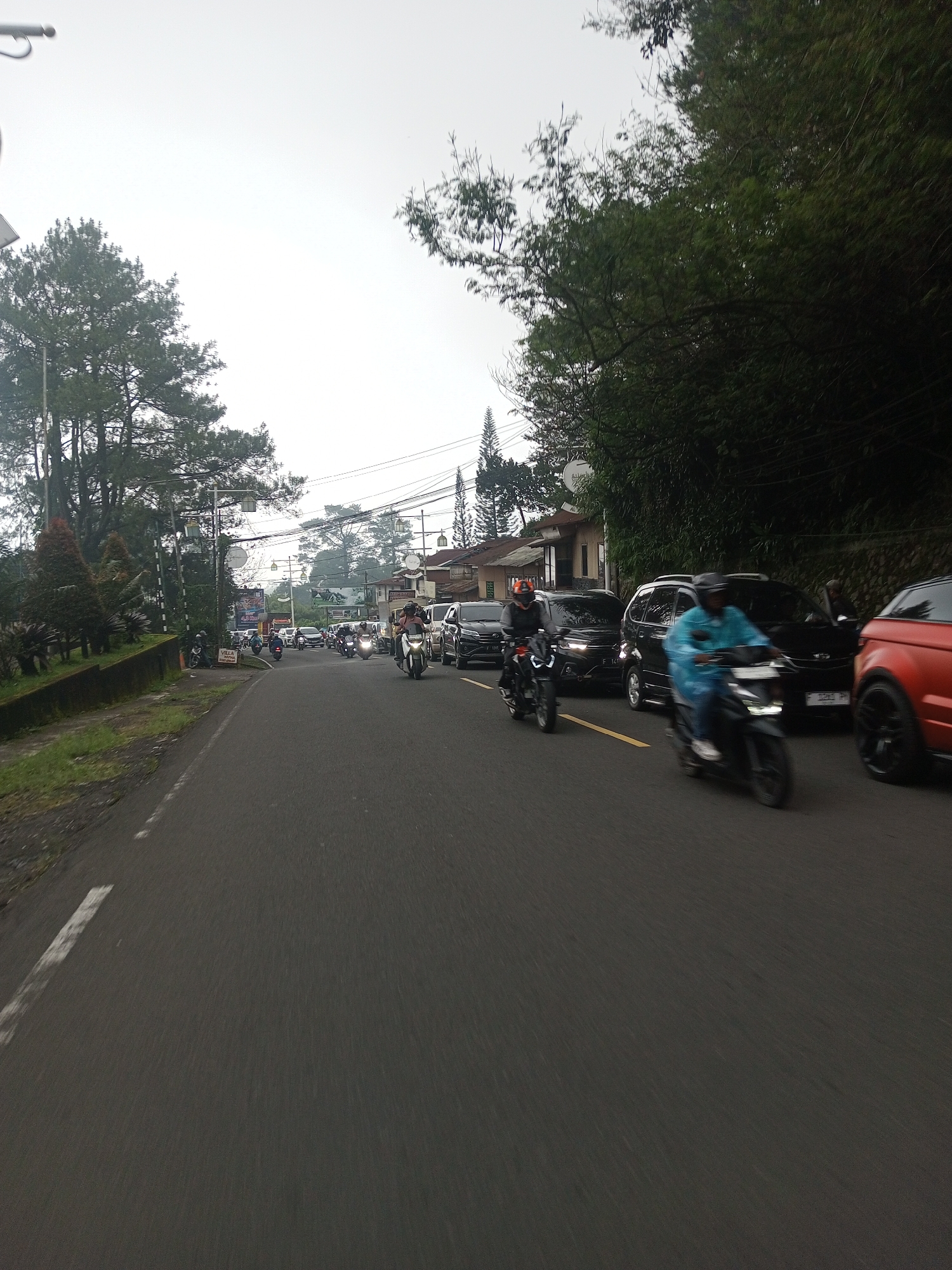 road in what appears to be a congested area, possibly Mae Chan District, Thailand. Several cars and motorcycles are present on the road. One person on a motorcycle is wearing a blue raincoat. Trees and greenery line the side of the road. The sky is overcast.