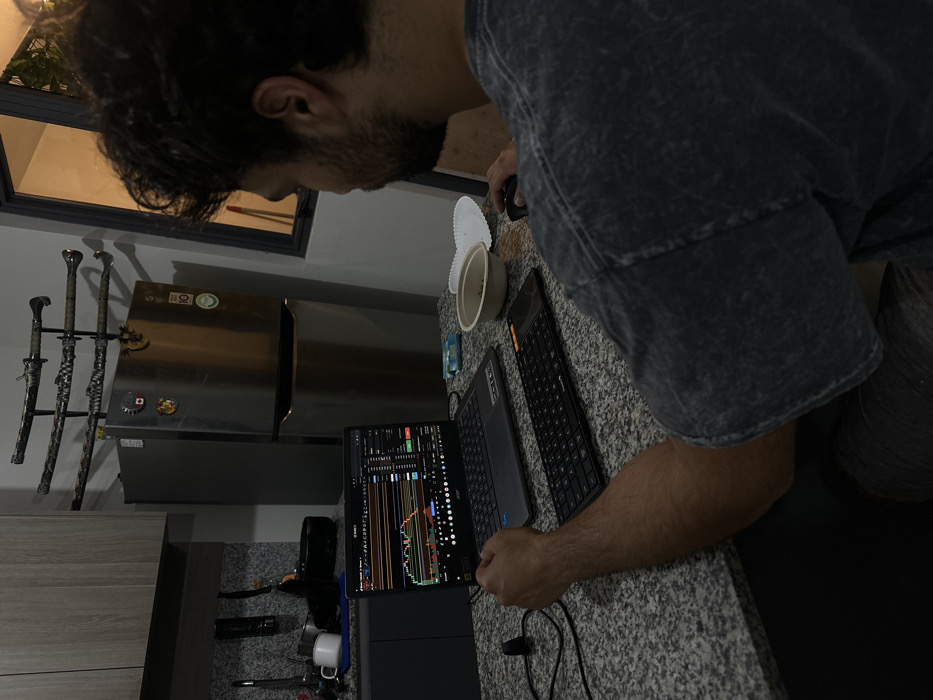 An adult male is seated at a speckled granite countertop, engaged with a laptop computer in an indoor residential setting, identified as the city of Cerro Prieto, Mexico. The male, viewed from the right side and rear, has dark, curly hair and a beard, wearing a dark, possibly acid-washed, t-shirt and dark pants. His left arm rests near an external black keyboard with an integrated trackpad, positioned in front of the laptop, while his right hand manipulates a black computer mouse. The laptop screen displays financial trading charts, including candlestick patterns, graphs, and numerical data. To the right of the keyboard are a small, beige disposable bowl containing dark material and a white, heart-shaped paper or plastic item. A small, light blue and white object, possibly a cigarette pack, is located behind the laptop. In the background to the left, a kitchen area features dark gray base cabinets and light brown upper cabinets. A white mug and other kitchen items are visible on the counter. A two-door stainless steel refrigerator stands in the corner, adorned with several magnets, one resembling the Canadian flag and another gold-colored, possibly animal-shaped. Above the refrigerator, a black wall-mounted rack holds three decorative swords horizontally. To the right, a dark-framed window or glass door reveals a dark exterior, with a vertical object, possibly a broom or mop, faintly visible through it. The overall lighting is artificial, suggesting evening or night.