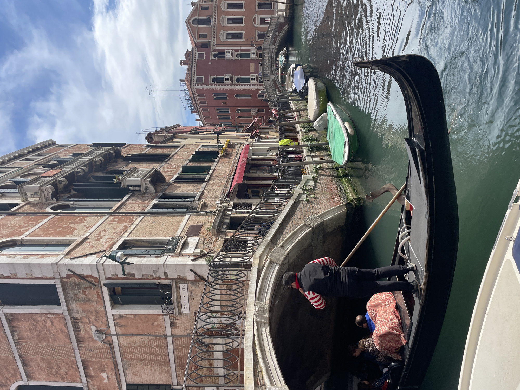 gondola with passengers being propelled along a canal in Venice, Italy. The gondolier, wearing a black jacket and a shirt with red and white stripes, stands at the rear of the boat using a long pole to navigate the waterway. Several passengers are seated in the gondola. The canal is bordered by buildings of brick and stone, some with balconies and awnings. One of the buildings has a sign reading "FONTE S. STIV," which refers to the Fontego dei Turchi, a historic palace. A small bridge crosses the canal in the background. Other boats are moored along the canal's edge. The sky is partly cloudy.