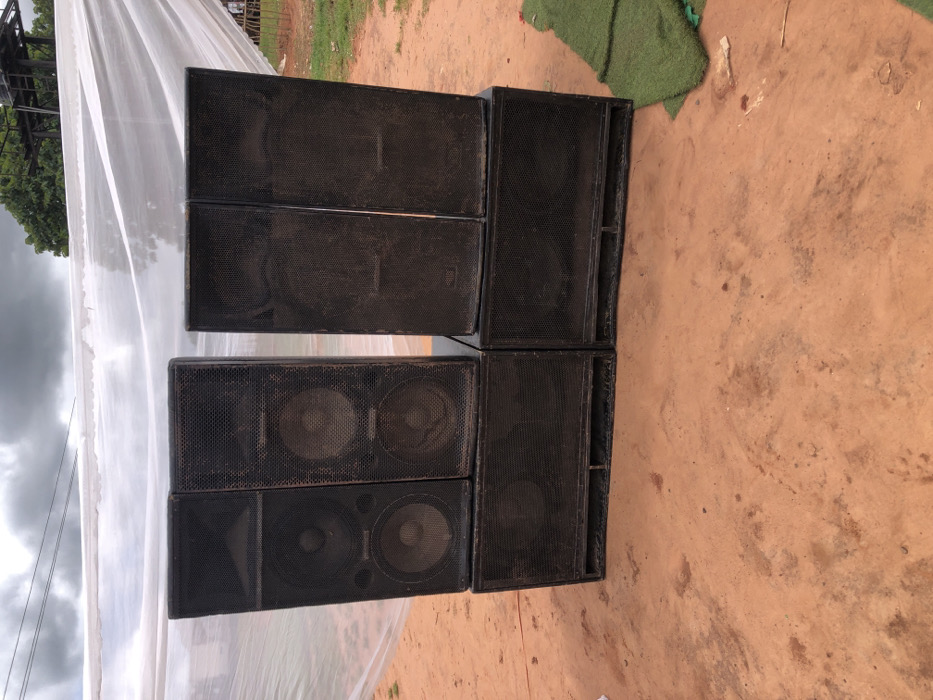 The image displays an outdoor scene in Amanuke, Nigeria, featuring professional audio equipment. Six black speaker cabinets are arranged in two stacks on reddish-brown, compacted dirt. Each stack consists of two taller, narrower speakers placed atop a single wider, shorter subwoofer cabinet. All speakers have metal grilles covering their cones and show signs of dust and use. In the background, a translucent white fabric, possibly part of a canopy or tent, stretches across the upper portion of the frame. Beyond this fabric, green foliage from trees and a dark, multi-level metal structure are visible against an overcast sky. To the right of the speaker stacks, a piece of green artificial turf is folded or rolled on the ground. No individuals or active interactions are present in the scene.