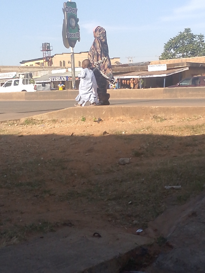 This image captures a daytime street scene in the city of Jos, Nigeria. In the foreground, a reddish-brown dirt patch with sparse dry grass and small debris occupies the lower portion of the frame, bordered by a concrete curb and slab. Midground features a paved asphalt road separated by a concrete median. Two individuals walk on the far side of the median, moving from right to left. An adult, likely female, wears a full-length, patterned garment in tones of brown, beige, and blue, with sandals. A prominent, multi-stranded decorative chain hangs from her right side. A young child, dressed in a light blue traditional garment (caftan-style top and trousers) and sandals, walks closely behind the adult. In the background, a commercial street is visible. From left to right: a multi-story building features a red and white "PHARMACY" sign; a white van or car is parked or moving on the road; a tall advertising pole displays "OPay" and "Face ID" logos with a stylized bearded face; a single-story building with a blue and white "STESHA'S" sign has a person in a yellow shirt standing outside; another single-story building features a dark and white "BENEXIC FURNITURE" sign, with mannequin heads displaying wigs positioned outside; a dark-colored vehicle is partially visible on the road; and a large green-foliaged tree stands on the far right. Above the buildings, a water tank on a metal tower is visible against a clear, light blue sky. Bright sunlight illuminates the scene, casting distinct shadows.