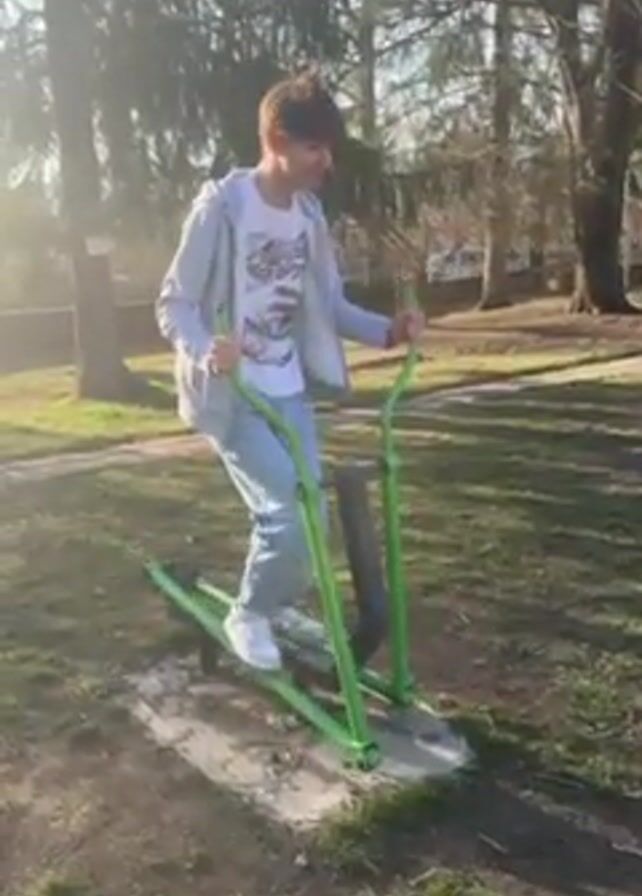 A young man exercises outdoors on a stationary strider-type machine. He stands on the black footrests, holding the green handles of the device. The machine is installed in a small patch of packed earth, bordered by grass and fallen leaves. The man is wearing jeans, white sneakers, a white graphic tee shirt, and a light gray hoodie. Trees are visible in the background. The sun is shining.