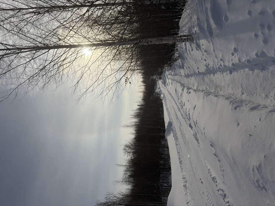 The image depicts a snow-covered, unpaved track in a natural environment, likely on the outskirts of Nizhny Tagil, Russia, given the industrial element in the distance. A bright, low sun is visible through the bare branches of birch trees on the right side of the frame, casting shadows. The foreground is entirely covered in untouched snow, transitioning to a well-defined set of vehicle tracks on the left side of the path. To the right of these, a narrower, deeper track, consistent with foot traffic or possibly skis, runs parallel. Both tracks lead uphill and curve slightly to the left into the distance. Snow banks line the sides of the path. Dense, bare-branched deciduous trees and shrubs form a dark, thicket-like border on both sides of the track. On the immediate right, several slender birch trees with light-colored bark stand prominently, their branches silhouetted against the bright sky. In the far distance on the left, an industrial structure, possibly a chimney or tower, rises above the tree line, confirming the urban-industrial context of Nizhny Tagil. The sky is a light gray-blue, partially overcast, with a notable bright spot where the sun is positioned. A faint halo effect is discernible around the sun. No people, animals, or active subjects are visible.