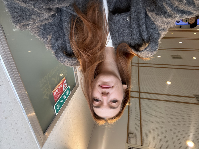 A woman with red hair and fair skin looks directly at the camera. She is wearing a gray, fuzzy cardigan over a white shirt. Behind her is a room with a white, perforated wall and recessed lighting. A window with signs and writing is partially visible on the left. To the right, a person is reflected in a screen. The photograph is rotated 180 degrees.