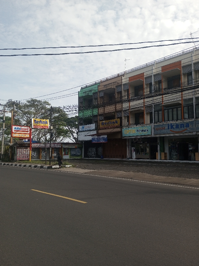 The scene depicts a commercial street in a location consistent with Indonesia, based on textual evidence from visible signage, rather than Thanthirimale, Sri Lanka